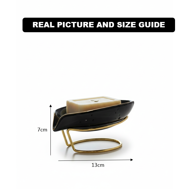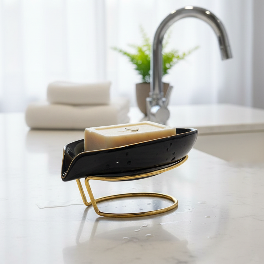 Add a touch of elegance and practicality to your bathroom, kitchen, or wash area with the GoldFrame Ceramic Soap Tray by Matrix. Crafted from high-quality ceramic, this soap tray features a perforated, self-draining design that keeps your soap dry, firm, and long-lasting. The golden metal base stand adds a luxurious modern touch while providing stability and sophistication. Its smooth glazed finish ensures easy cleaning and resistance to moisture, making it a perfect blend of style and functionality. Ideal for modern, minimal, and luxury interiors, this soap tray elevates everyday hygiene.