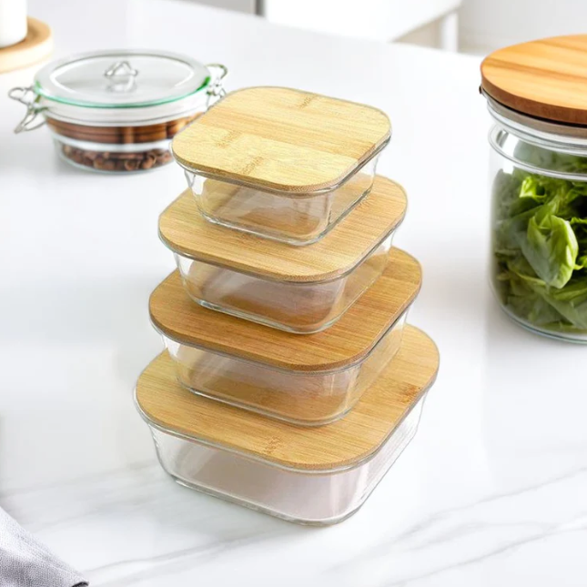 4Pcs Airtight Bamboo-Lid Glass Bowls Set – Square